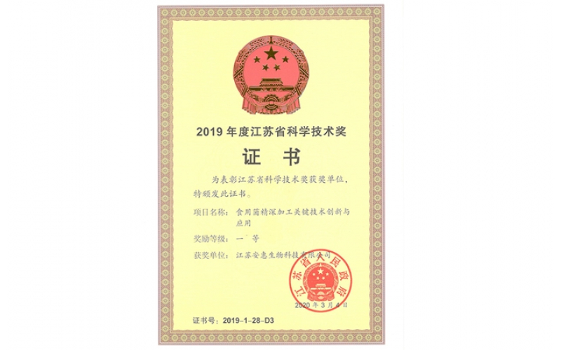 2020年3月,由江蘇安惠生物科技有限公司參與南京財經大學、南京農業大學、中國農業大學等科研院所承擔的食用菌精深加工關鍵技術創新與應用榮獲江蘇省科學技術獎一等獎。